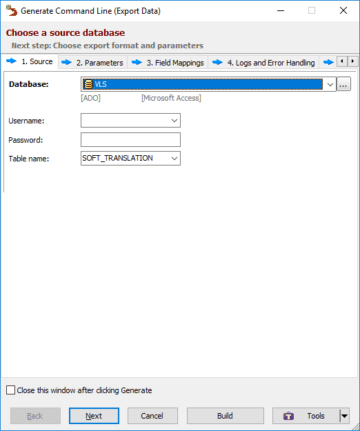 /TrgDBInterface=ado /TrgDBKind=FILE "/TrgDBDriver=Microsoft Access" "/TrgDB=C:\Access Databases\dwh_extract.mdb"